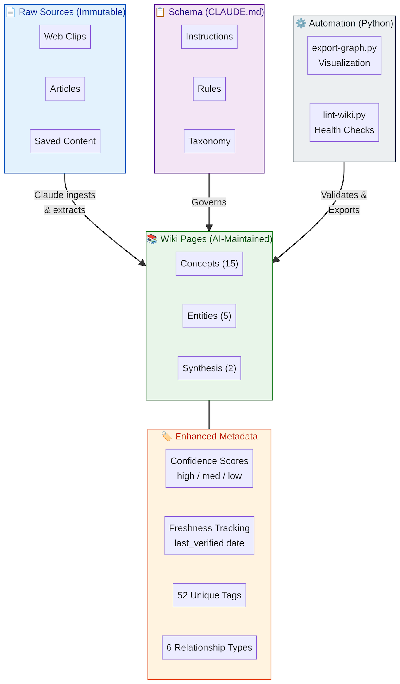 System Architecture — Four-layer stack from raw sources through AI-maintained wiki pages, governed by schema, validated by automation
