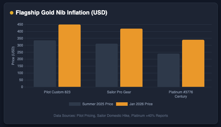 In January 2026, Japan's leading pen manufacturers Pilot, Sailor, and Platinum implemented dramatic price increases ranging from 10% to 100%, marking the industry's most significant pricing shift since 1985. The catalyst was a perfect storm: soaring gold prices above $4,500/oz and silver past $88/oz, persistent structural challenges in Japan including severe labor shortages, elevated energy costs, and a weak Yen, increasing shipping costs and tariffs roiling the math in unpredictable ways. This confluence of macroeconomic shocks forced a complete repricing across domestic and export portfolios for an industry that had maintained relative price stability for decades.