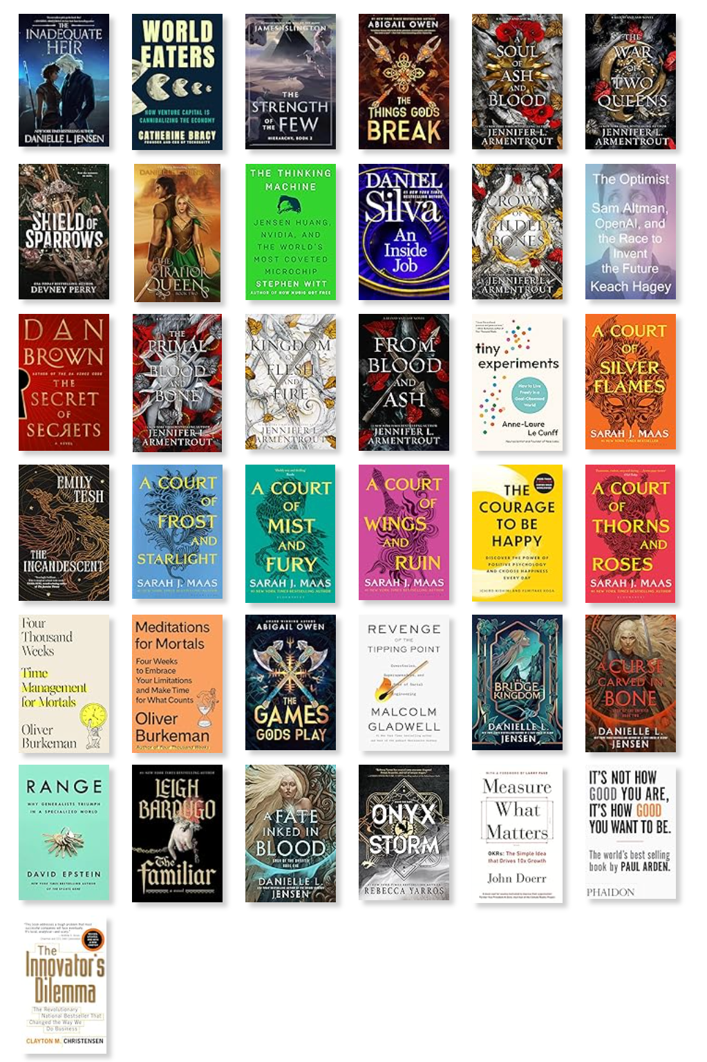 "2025 has been a year of sprawling empires, divine power struggles, and deep dives into the mechanics of our modern world. My reading list this year spanned 37 books, taking me from the dragon-filled skies of the Empyrean to the high-stakes boardrooms of Silicon Valley. Whether I was exploring the philosophy of time management or the intricate politics of faerie courts, each book offered a new lens through which to view the world. Below is a breakdown of my journey through fiction and non-fiction this year."